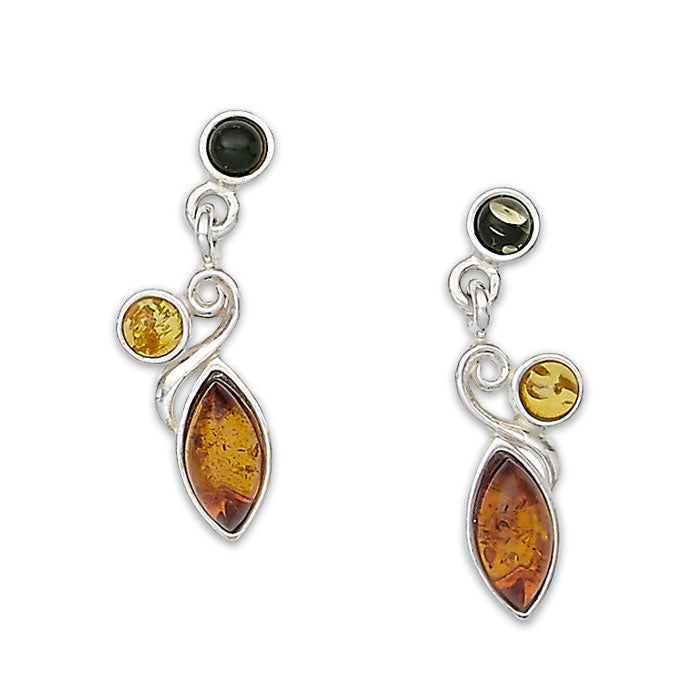 These multicolored earrings feature marquise-shaped amber stone, and round stones of sage amber and citrine with sterling silver posts.