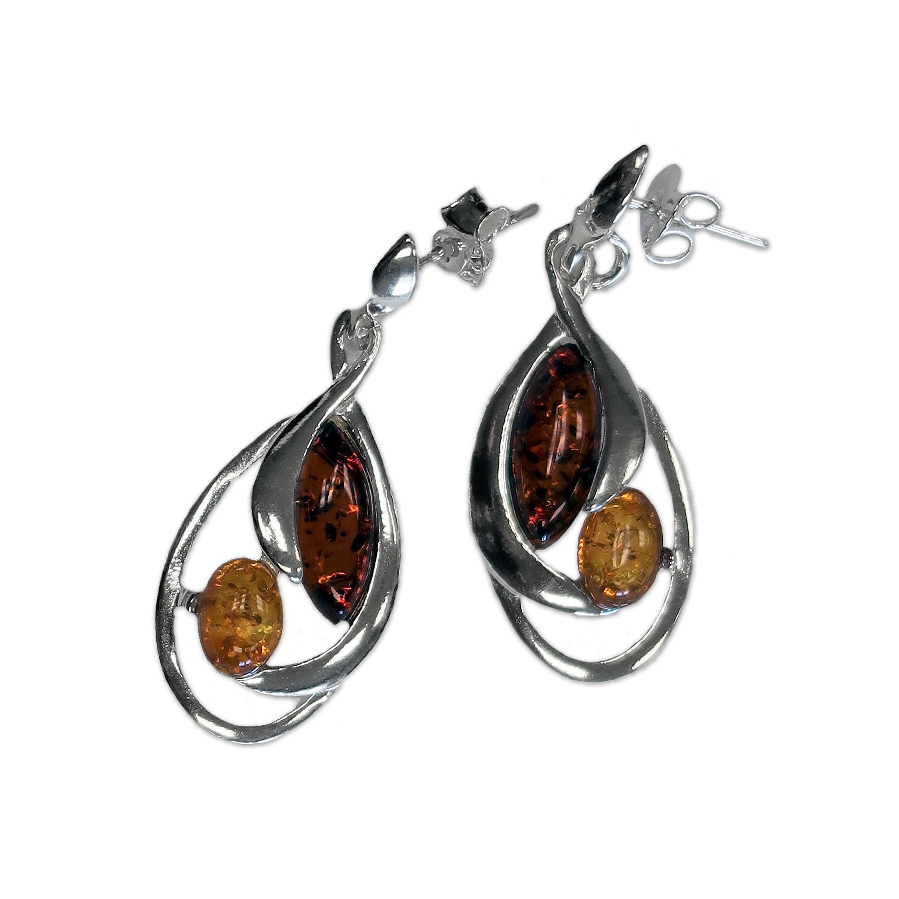 These elegant earrings are definitely eye-catching! A sterling silver setting holds a marquise-shaped cognac amber stone and a smaller oval-shaped honey amber stone. Post backs.
