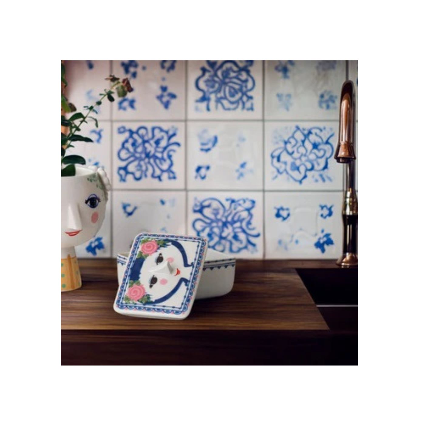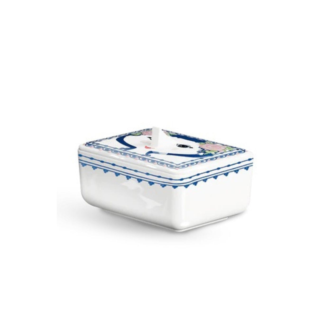 With this exclusive Dora bonbonniere, designed with inspiration from Bjørn Wiinblad’s original archival production, you get a unique design icon created from original shapes and colors. In addition to the soft, round shape, the Dora bonbonniere also has the well-known triangular nose, almond-shaped eyes, smiling lips and rose-red cheeks. You’ll find blue hair and roses surrounded by a decorated frame on the lid that you can lift in the nose, and on the sides, beautiful stripes with dots run all the way around. Under the lid is a discreet silicone ring, so you can be sure that no unnecessary air gets into the bonbonniere. The bonbonniere stands beautifully in shiny glazed porcelain.