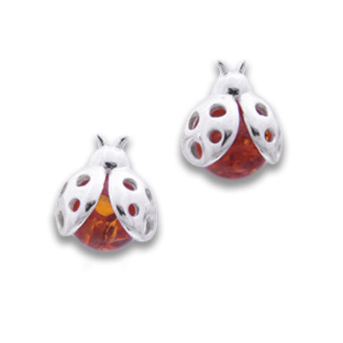 Stud earrings featuring a ladybug made of honey-colored amber and sterling silver. Matching necklace also available.