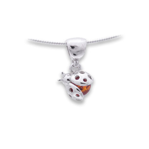 This necklace features a honey amber and sterling silver ladybug pendant. Matching earrings also available.