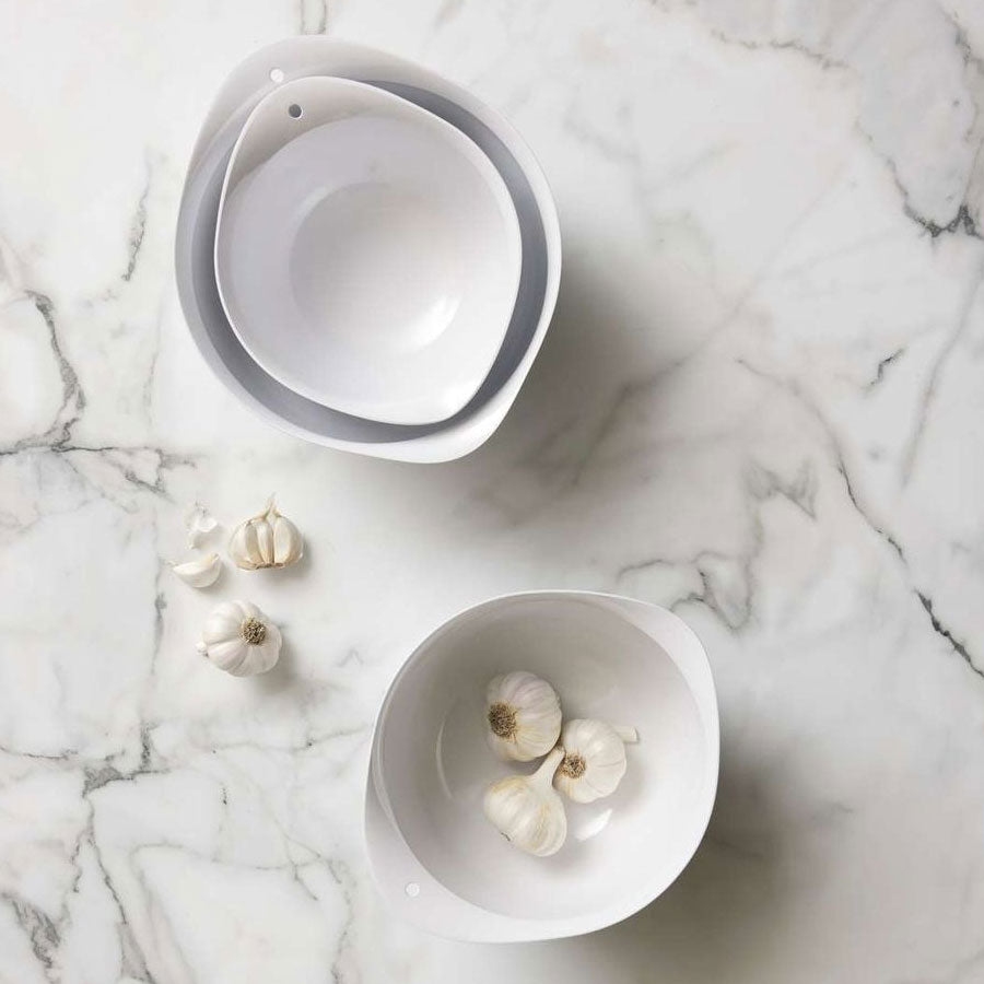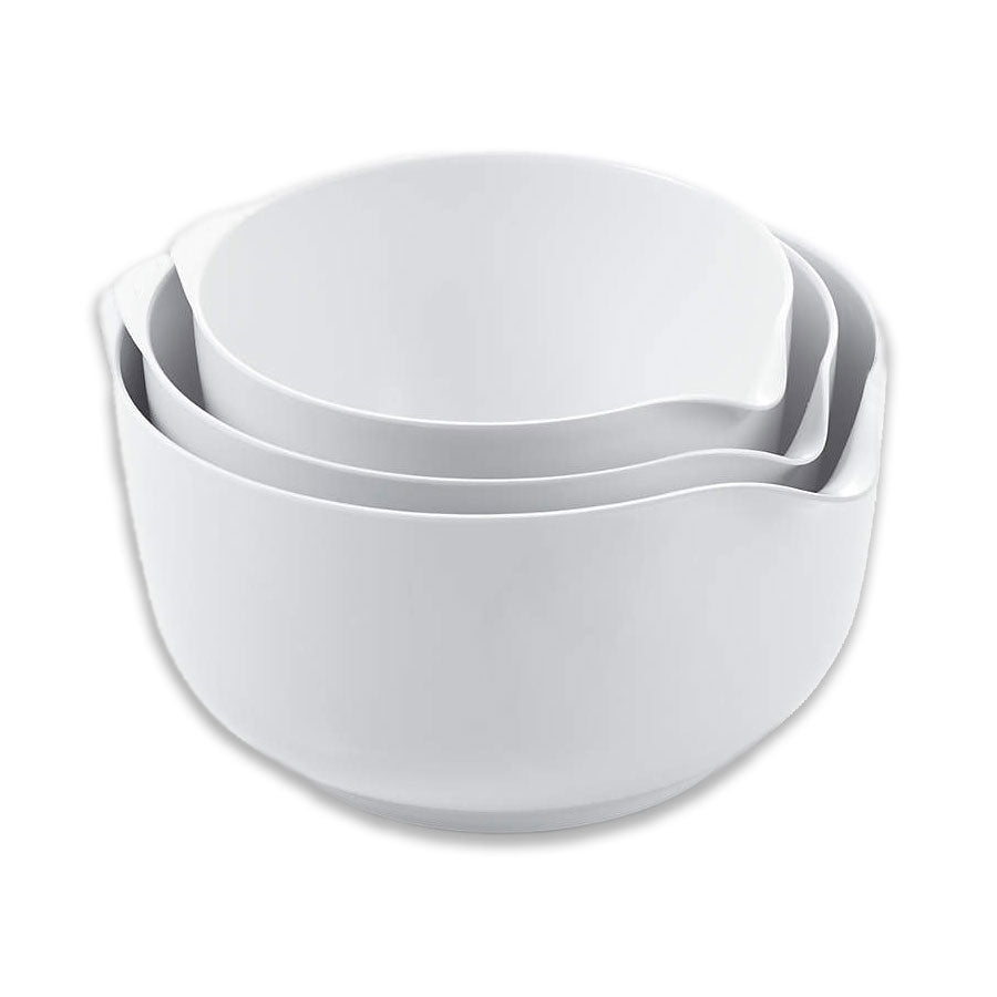 This white melamine mixing bowl has a special anti-slip ring that holds the bowl in place on your counter and is heat resistant up to 70 degrees. The 4L bowl is most practical for making dough, the 3L is ideal for larger amounts of batter, the 2L is perfect for mixing flour, and the 1.5L is especially suitable for whipping cream. Each size sold separately.