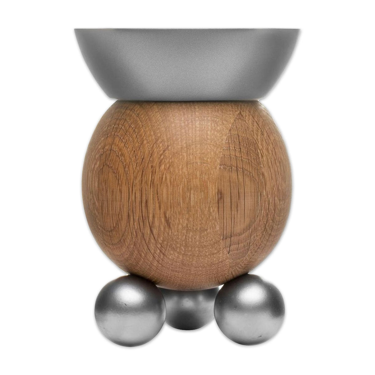 The classic barrel candle holder fits either a pillar or taper candle. Made of oak wood and stainless steel, it stands at 5 inches tall. Candle not included.