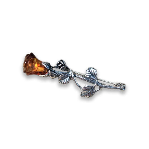 This brooch features a hand-etched amber rose with a sterling silver stem. Matching earrings and necklace also available.