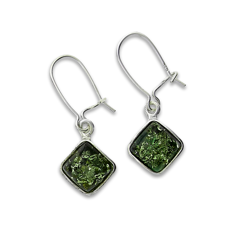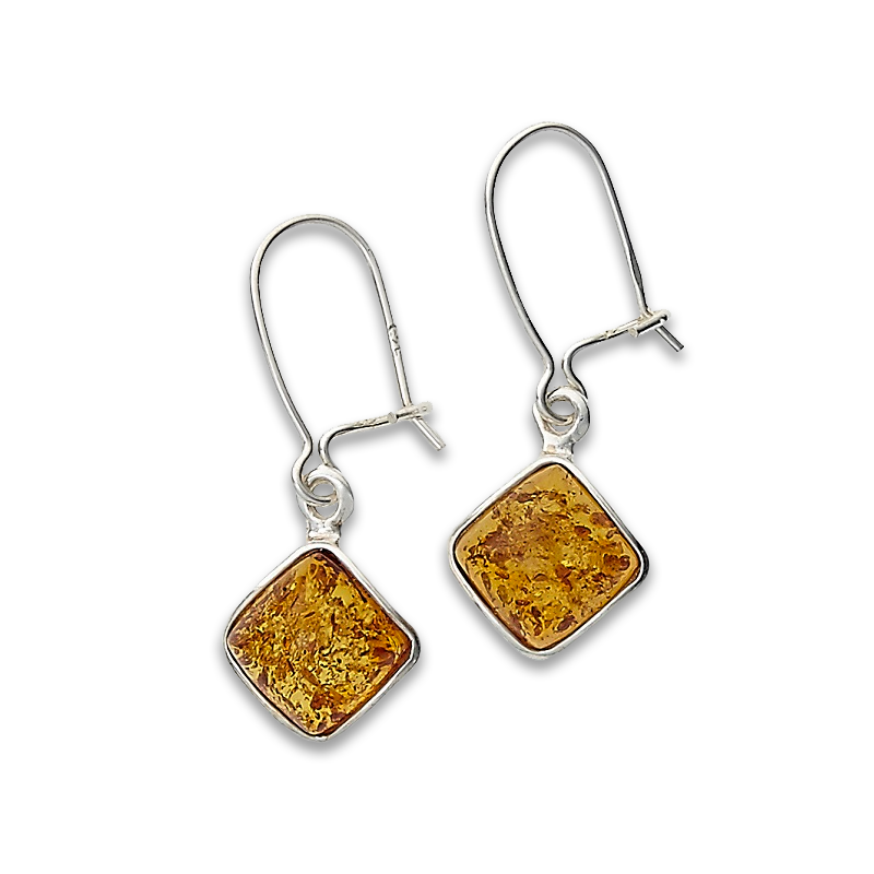 Lock wire drop earrings, featuring a tilted square of either honey or sage amber, set in sterling silver. Each earring measures approximately 1 inch long. Matching neckace also available.