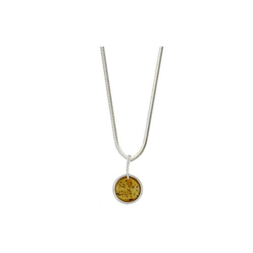Honey amber set in a round sterling silver pendant. Pendant is .25 inches in diameter and comes with an 18-inch curb chain.