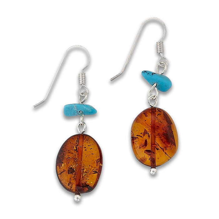 Honey amber stones are paired with turquoise chips and set in a sterling French wire.