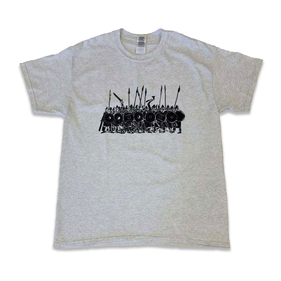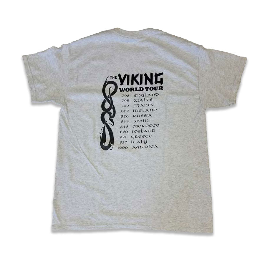 This grey short-sleeved t-shirt features Vikings with shields and spears on the front and "Viking World Tour" with dates and countries listed on the back.
