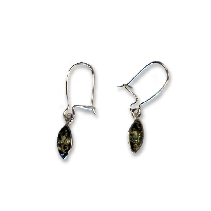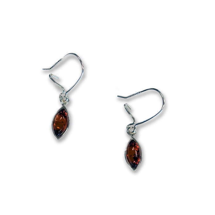 These adorable earrings feature a marquise-shaped amber stone set in sterling silver with lock wire. Measure approximately 1 inch long.